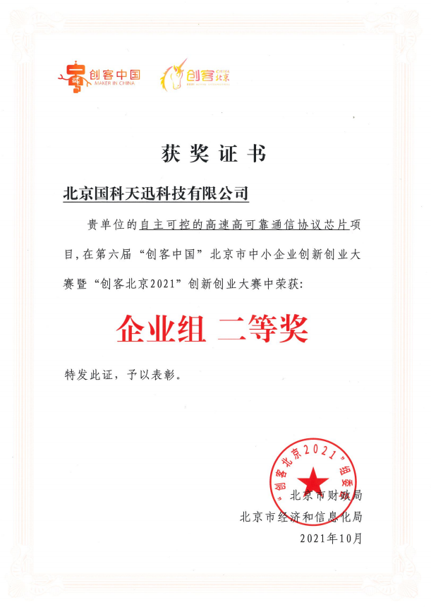 大赛自6月启动以来,受到广大中小企业和创客团队高度关注,吸引了全市近5千个项目报名。国科天行体育平台官方网站-天行体育(中国)参赛的“自主可控的高速高可靠通信协议芯片”项目,经初赛、复赛两个月激烈角逐,在众多项目中表现抢眼,成功入围新一代信息技术领域决赛,经路演获企业组百强,后与百家企业共同比拼及专家组评审后最终获此殊荣。